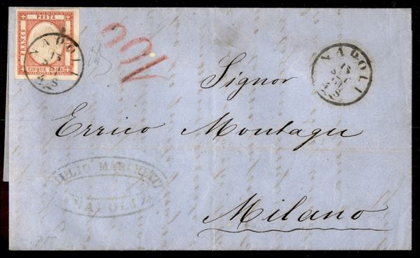 Province Napoletane in uso tardivo - 5 grana (21) su lettera da Napoli a Milano del 13.9.61 (dopo la proclamazione del Regno) - ex coll. Provera
