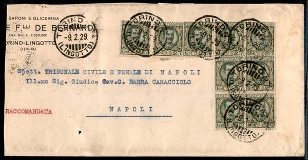 Quartina pił coppia pił tre singoli del 25 cent Floreale (200) su busta da Torino a Napoli del 9.2.29