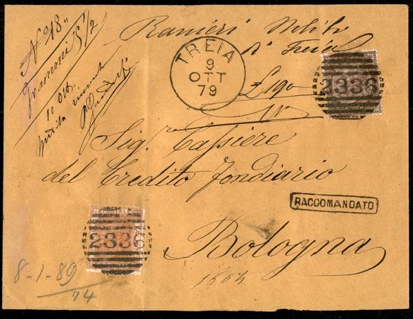 Raccomandata affrancata con 30 cent V. Emanuele II (T19) + 20 cent V. Emanuele II (28a) da Treia a Bologna del 9 ott. 79 - ex coll. Provera