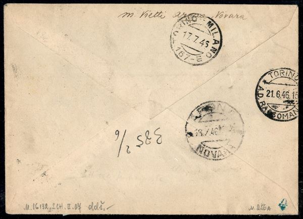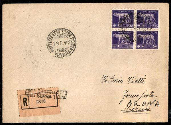 Raccomandata da Castelletto Sopra Ticino 19.6.46 per Arona affrancata con Regno quartina del 3,70 lire violetto (256A) in uso tardivo - ex coll. Provera
