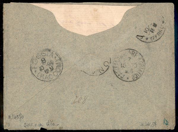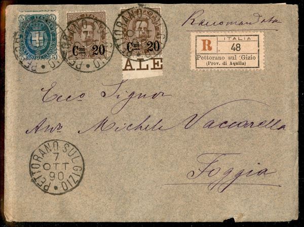 Raccomandata da Pettorano sul Gizio 7 ott 90 per Foggia affrancata con 5 cent verde Stemma + due esemplari del 20 cent su 30 bruno (44 + 57) - uno con bordo foglio - ex coll. Provera