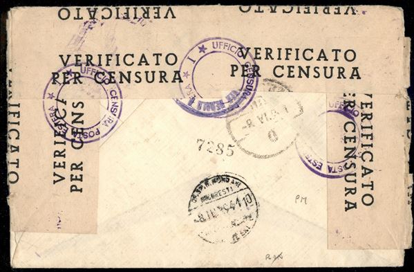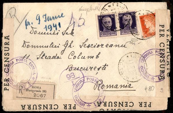 Raccomandata per la Romania da Roma 29.5.41 con coppia 50 cent violetto + 1,75 lire arancio Imperiale (251 + 254) - bolli e fascette di censura - non comune in questo periodo