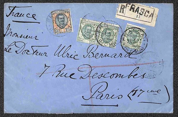 Raccomandata per Parigi da Frascati 31.5.27 affrancata con Floreale coppia pił singolo 25 cent verde e verde oliva (200) + 2,50 lire verde mirto e arancio (203) - ex coll. Provera