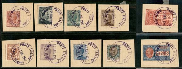 Rodi 12 Lug. 1912 (viola) - 10 valori diversi di Regno usati su altrettanti frammenti