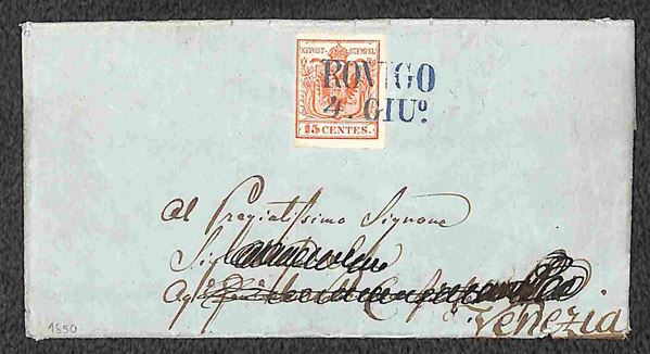 Rovigo (azzurro - P.ti 11) - 15 cent (3a) su lettera per Venezia del 4.6.1850 (quarto giorno d'uso) - indirizzo in parte cancellato