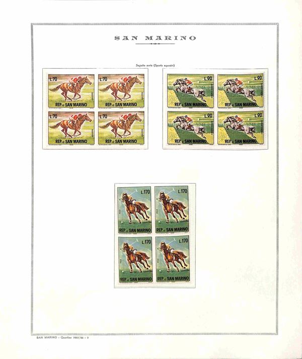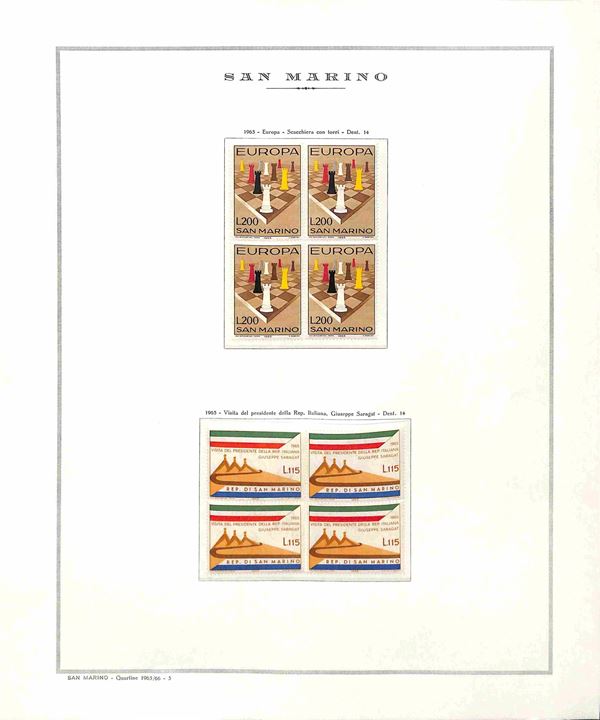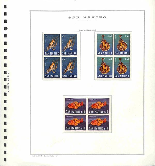 SAN MARINO - 1965/1998 - Collezione completa di valori nuovi e serie complete in QUARTINE - montate in 5 album con fogli Marini in ottime condizioni - gomma integra - valore di catalogo oltre 3600€ - merita esame
