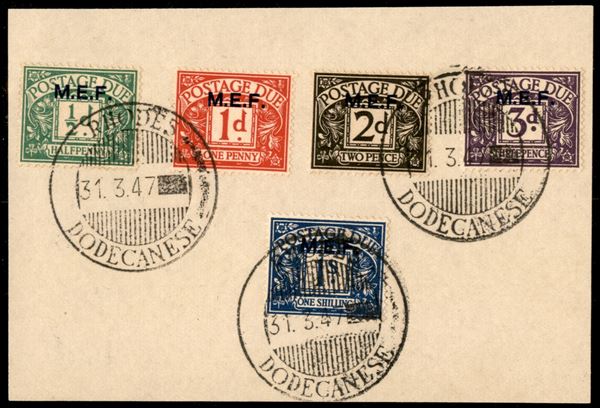 Segnatasse (1/5) - serie completa - 5 valori usati a Rhodes (31.3.47) su frammento nell'ultimo giorno di validità