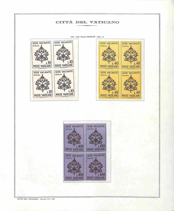VATICANO - 1964/1998 - Collezione avanzata di valori nuovi e serie complete in QUARTINE montate in 4 album Marini in ottime condizioni - pochissime mancanze negli ultimi anni - gomma integra - valore di catalogo oltre 3000€ - merita esame
