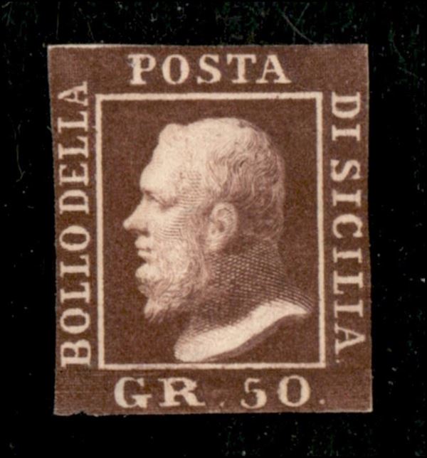 1859 - 50 grana lacca bruno scuro violaceo (14b) - nuovo senza gomma - ritagliato nei margini e assottigliato in basso