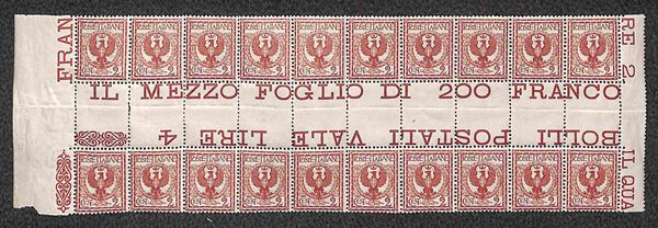 1901 - 2 cent Floreale (69) - blocco orizzontale di 20 con interspazio di gruppo al centro - gomma integra - ottimamente centrati (1.800/18.000)