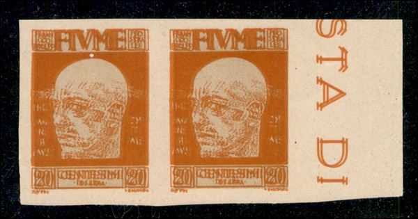 1920 - 20 cent D'Annunzio (119k + c) - coppia orizzontale bordo di foglio - non dentellati + doppia stampa - gomma integra - freschi
