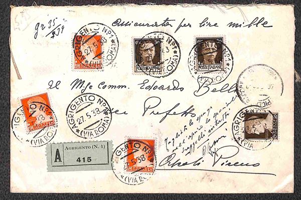 Busta assicurata affrancata con Imperiale un 10 cent (245) + due 30 cent (249) + tre 1,75 lire (254) con sigilli intatti (con appunto scritto sul fronte) da Agrigento per Ascoli Piceno via Roma del 27.5.38 - ex coll. Provera