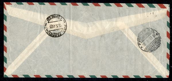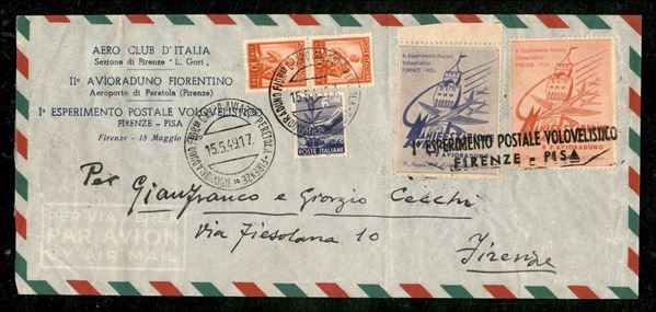 Busta I° Esperimento Postale Volevolistico - busta affrancata con tre valori Democratica (556 + due 559) + le due etichette commemorative annullate con lineare I° Esperimento Volevolistico Firenze Pisa - Firenze 15.5.49