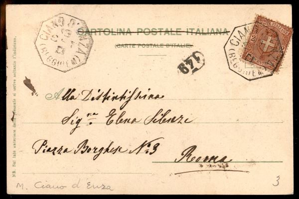 Cartolina affrancata con 2 cent Stemma (66) annullato con ottagonale di Ciano d'Enza del 3. set. 01. per Roma - ex coll. Provera