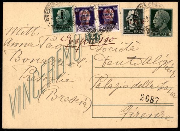 GNR Brescia mista con fascetti - Intero postale da 15 cent con affrancatura aggiuntiva composta da 15 cent tiratura di Brescia (472/Ihb) con soprastampa fortemente spostata a destra + 25 cent e due 50 cent fascetti (491/493) da Brescia a Firenze del 24.4.44 - molto bella