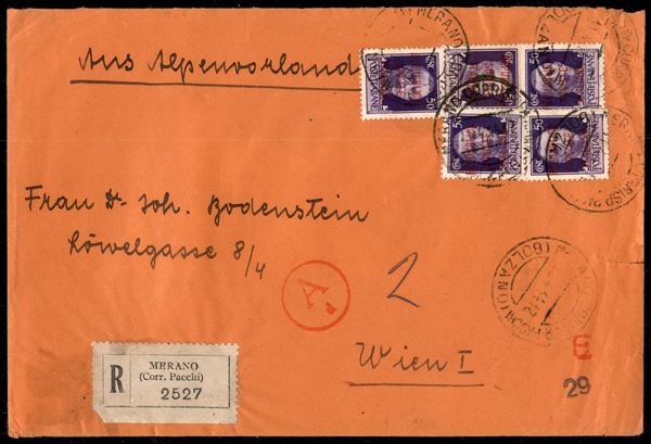 Quartina pił singolo del 50 cent (493) su raccomandata da Merano a Vienna del 11.4.44
