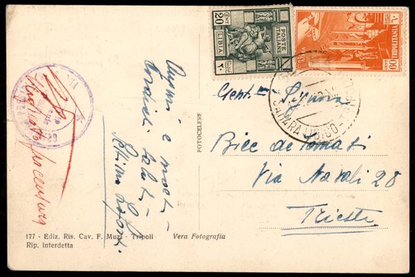 Sebha Sahara Libico Tripoli 15.12.40 - 20 cent (40) + 60 cent (Tripolitania 10 aerea) su cartolina per Trieste - Censura (Comando Presidio di Sebha/Ufficio Sprovvisto di Bollo) in viola al lato