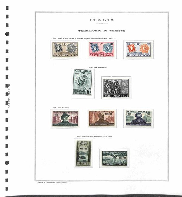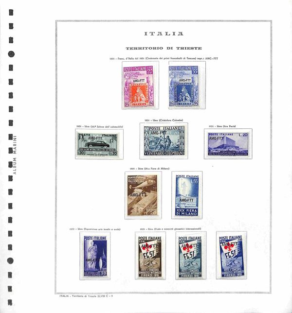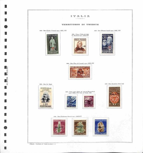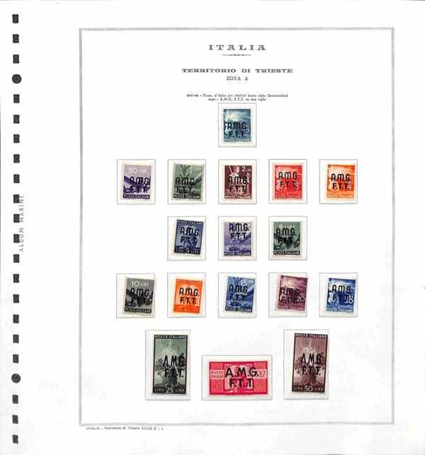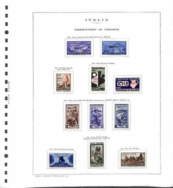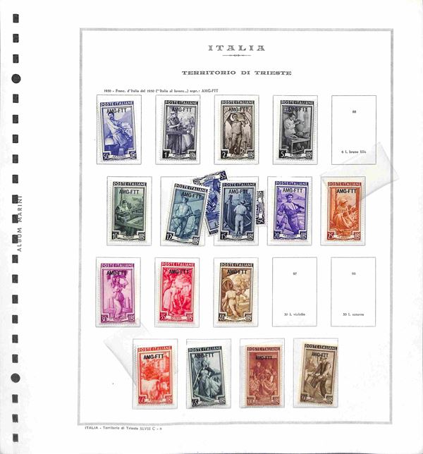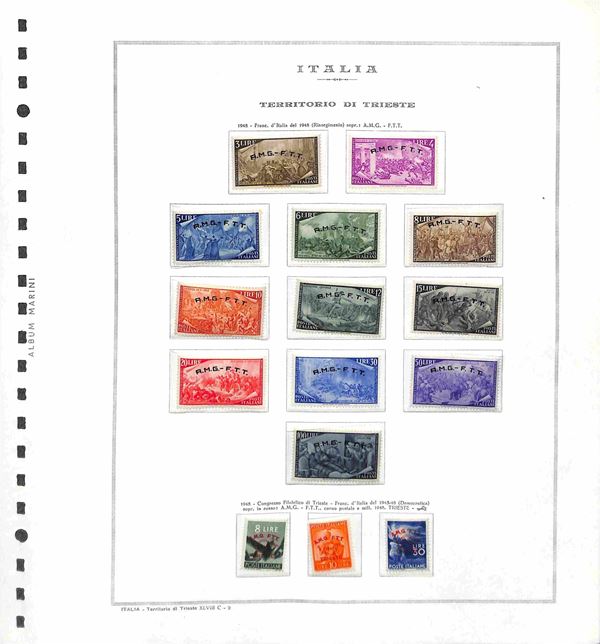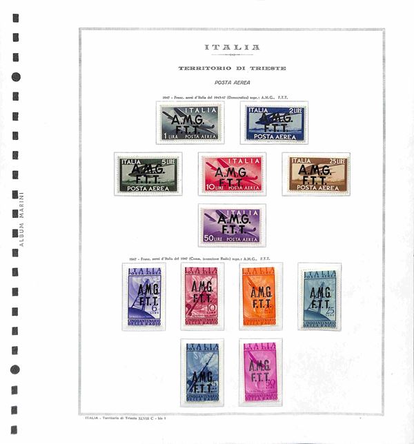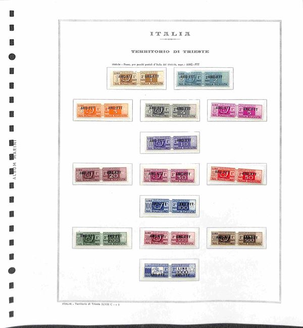 TRIESTE - AMG-FTT - 1947/1953 - Collezione completa con mancante solo la prima serie di Pacchi Postali - valori nuovi montati in album Marini - valore di catalogo oltre 6500 € - merita esame