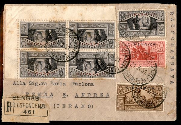 Virgilio - 15 cent (77) singolo + quartina + 30 cent (80) + 75 cent (82) - raccomandata da Bengasi a Teramo del 21.3.31 (1.850)
