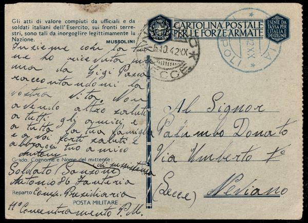 Zavia Tripoli (azzurro) 28.9.42 - cartolina postale in franchigia da 11° Concentramento P.M. per Lecce