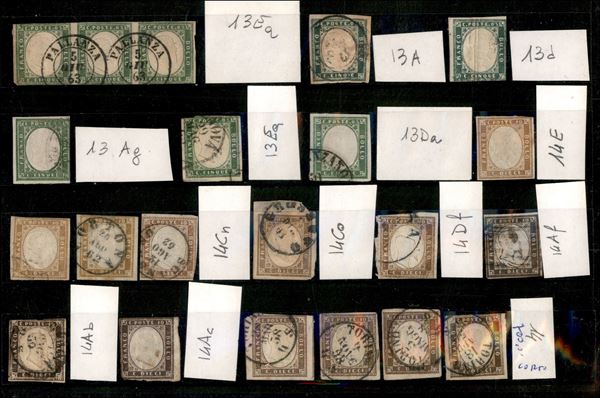1855/1863 - Insieme di 42 esemplari nuovi e usati della IV emissione (13/17) montati su 2 cartoncini - quasi tutti plattati con la relativa colorazione - molto utile per confronti