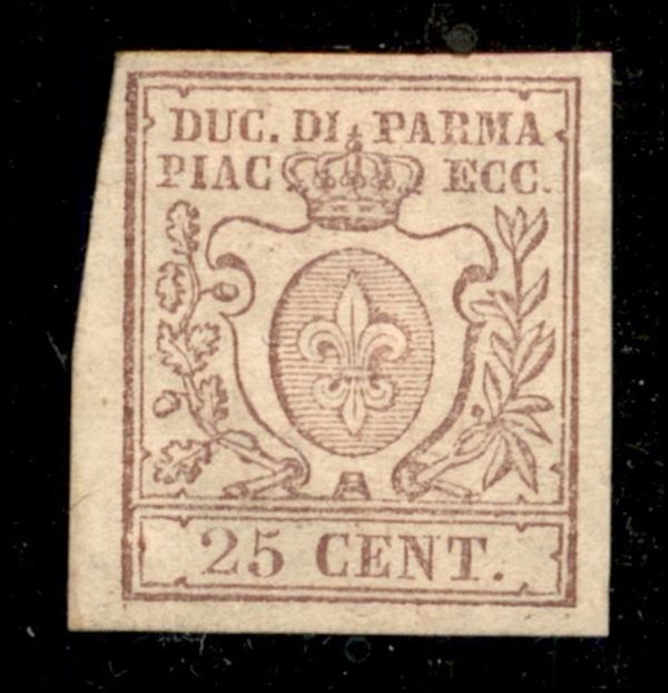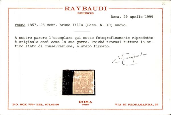 1857 - 25 cent bruno lilla (10) - nuovo con gomma originale e traccia di linguella - Diena + cert. Raybaudi