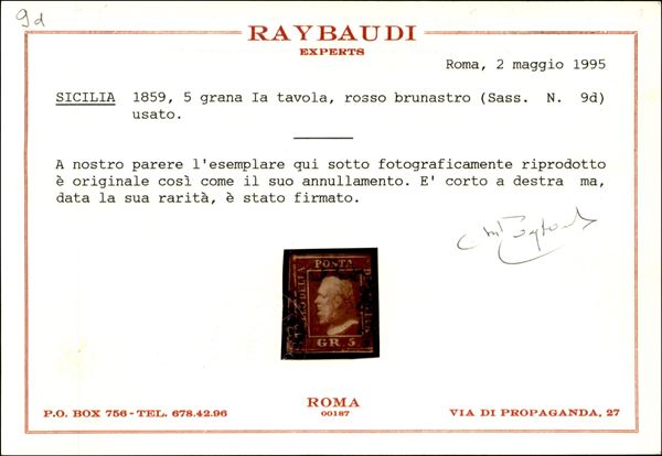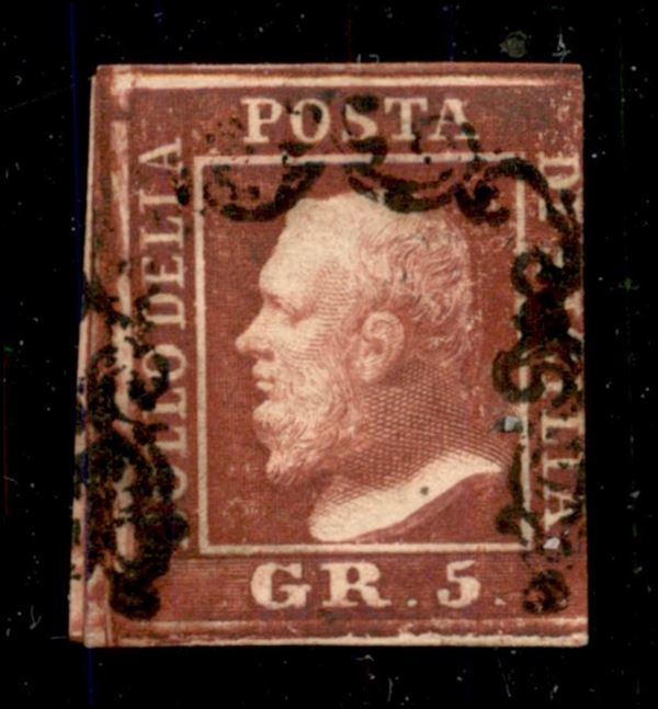 1859 - 5 grana rosso brunastro (9d) I Tavola - usato - corto a destra - cert. Raybaudi