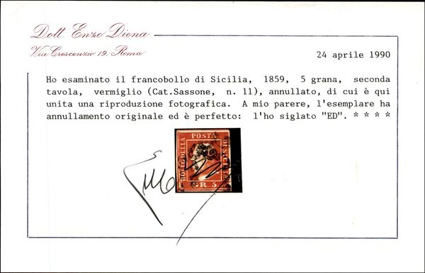 1859 - 5 grana vermiglio (11) II Tavola - usato - perfetto - E. Diena + cert. Diena