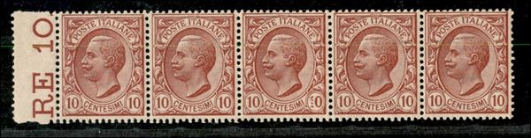 1906 - 10 cent Leoni (82/82q) - striscia orizzontale di cinque - pezzo centrale con cifra 1 formata da quattro puntini - gomma integra - ex coll. Provera