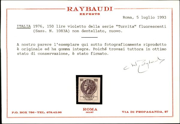 1976 - 50 lire Turrita (1083A) non dentellato - gomma originale integra - cert. Raybaudi