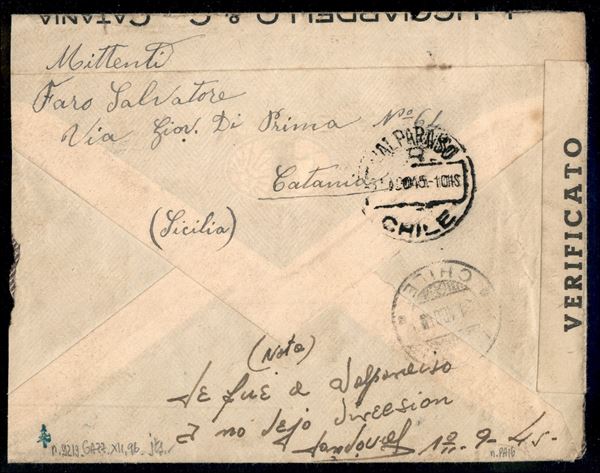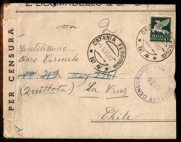 5 lire Imperiale (16) isolato su aerogramma da Catania a La Cruz (Cile) del 5.6.45 - interessante destinazione - ex coll. Provera
