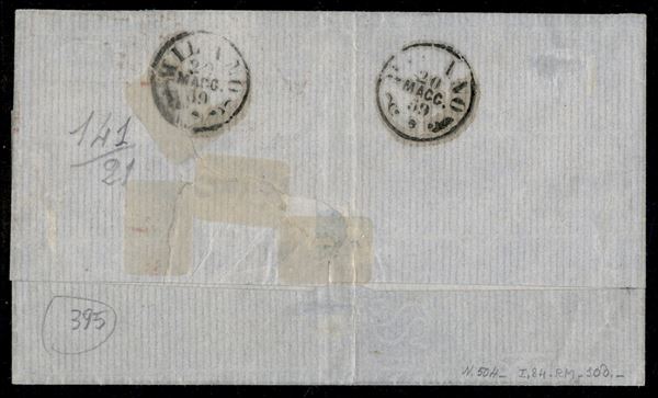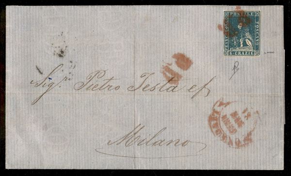 6 crazie azzurro cupo (15b) annullato con PD (rosso) su lettera da Livorno (banderuola) a Milano del 20.9.58 - ex coll. Provera