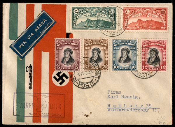 Aerogramma Fuhrer Dux - busta affrancata con valori delle serie Delfico + Aerea Vedute (193/196 + 1/2) da San Marino a Amburgo del 9.5.38