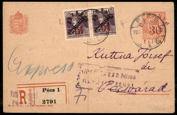 Baranya - Intero postale da 30 filler con complementari (57 coppia) raccomandato da Pecs a Pecsvarad del 8.1.20 - Alfani