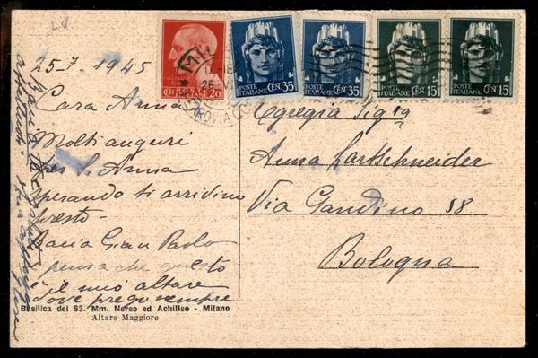 Bella affrancatura tricolore mista Luogotenenza e Regno (529 + 246 due + 250 due) su cartolina da Milano a Bologna del 26.7.45