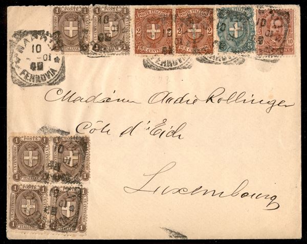 Bella quadricolore con esemplari di Umberto - quartina + coppia 1 cent (65) + coppia 2 cent (66) + 5 cent + 10 cent (67 + 60) da Napoli per Lussemburgo del 10.4.01 - ex coll. Provera