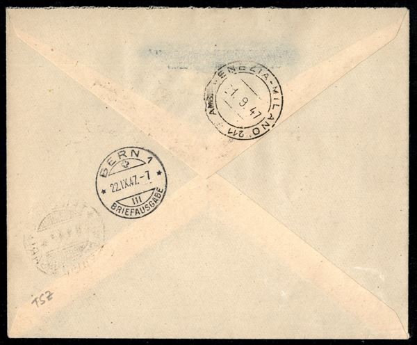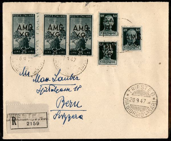 Bella raccomandata affrancata con Democratica tre 60 cent (6) due con varietà soprastampa capovolta e doppia soprastampa (6d + 6e) + tre 25 lire (19) da Trieste a Berna del 20.9.47 - bella monocolore