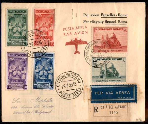 Bruxelles/Secondo Salone Aeronautico 12.7.39 (Longhi 3863) - aerogramma raccomandato con affrancatura mista Belgio Vaticano del volo Bruxelles Roma