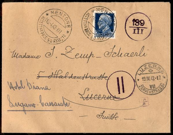Busta affrancata con 1,25 lire Imperiale (253) isolato da Mentone per Lucerna del 15.4.43 reindirizzata a Lugano - ex coll. Provera