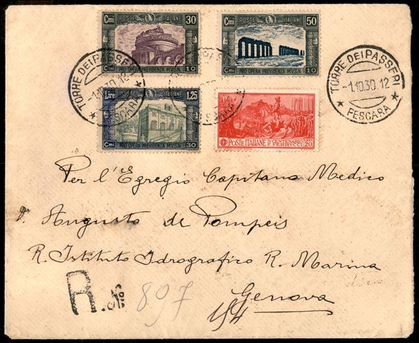 Busta raccomandata affrancata con tre valori Milizia III (272 + 273 + 274) + 20 cent Ferrucci (276) da Torre dei Passeri per Genova del 1.10.30 - bollo di arrivo - ex coll. Provera