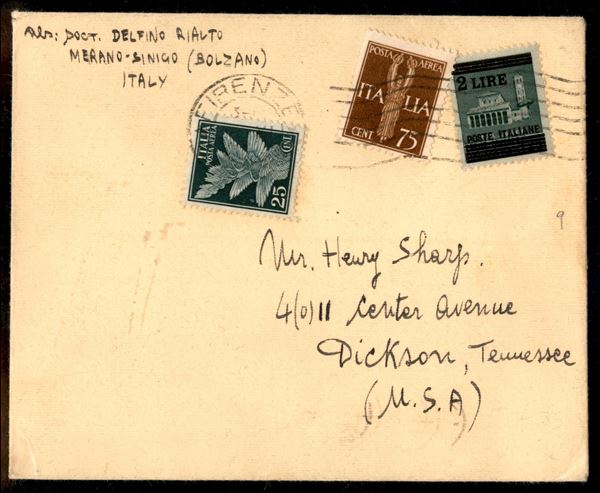 Bustina affrancata con 25 cent + 75 cent Posta Aerea (10 + 12) + 2 lire su 25 cent Monumenti Distrutti (525) da Firenze a Dickson (Stati Uniti) del 22.11.45 - molto bella