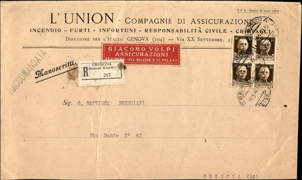 Bustone raccomandato "Manoscritti" affrancato con quartina del 30 cent Imperiale (249) da Cremona per Brescia del 18.4.30 - ritagliato in basso - ex coll. Provera