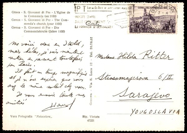 Cartolina affrancata con 35 lire Guerra Indipendenza (868) da Genova per Sarajevo