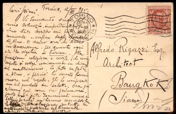 Cartolina illustrata affrancata con 75 cent Floreale (201) da Torino per Bangkok del 12.3.30 - rara destinazione