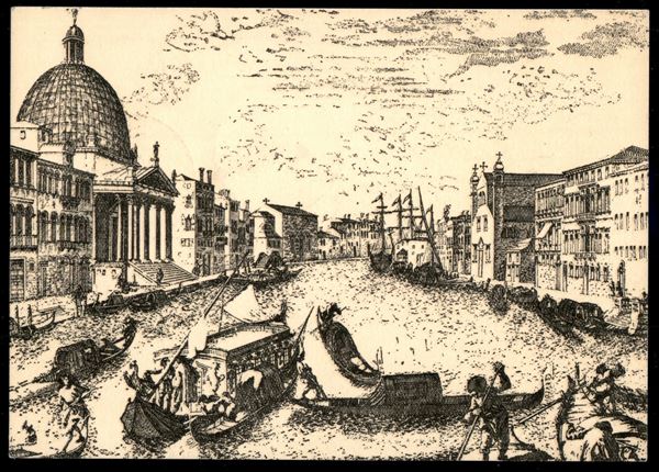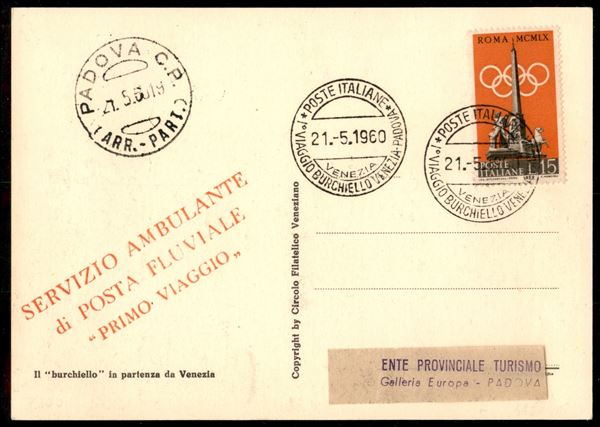 Cartolina illustrata con annullo I° Viaggio Burchiello Venezia Padova 21.5.60 su 15 lire Olimpiadi (861) - Servizio Ambulante di Posta Fluviale "Primo Viaggio"