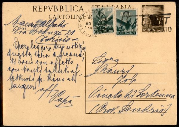 Cartolina Postale Fiaccola 6 lire (C138) in tariffa 15 lire con affrancatura complementare Democratica 1 lira + 8 lire da Torino 30.VII.1949 per Sondrio