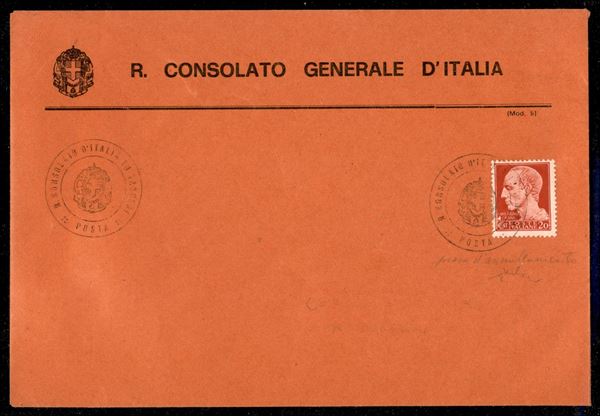 Consolato d'Italia a Tangeri - busta affrancata con 20 cent Imperiale (247) annullato con bollo del Consolato - prova di annullamento secondo Chiavarello