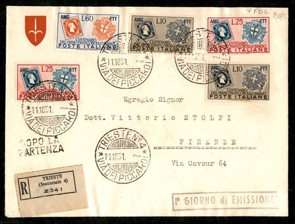 FDC Centenario Francobolli Toscana e Centenario Francobolli Sardegna (108/109 + 130/132) - le due serie su altrettante buste - Trieste 27.3 e 11.10 1951