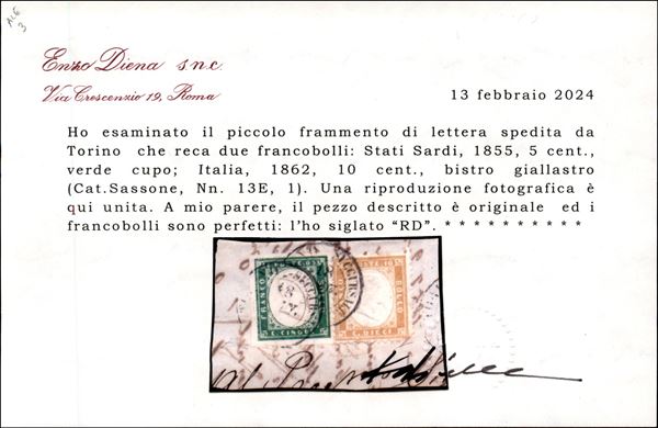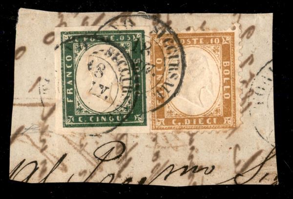 Frammento con affrancatura mista Sardegna Regno composta da 5 cent verde cupo + 10 cent bistro giallastro (13E + 1) - Torino 18.1.( ) - cert. Diena