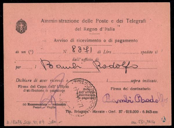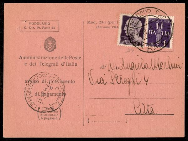 Gemelli - Die 1 lira Imperiale + Aerea (252A + 14) su avviso di pagamento - Firenze 17.11.45